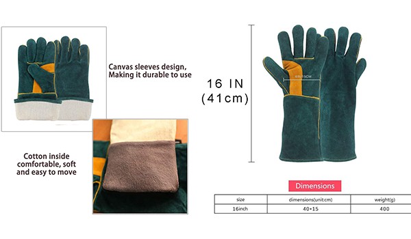 WZQH 16 generally laminates the high-temperature resistant Air-isolated Aluminum Foil and a flame retardant cotton cloth. Its full length is 16 inches with an extra-long 7.5 inches sleeve to protect your hands.