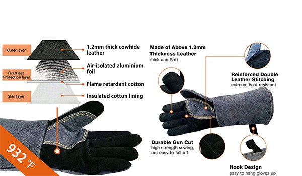 The Gloves are made from 1.2mm thick and soft cowhide leather that is fully heat resistant. The double leather stitching and high-strength sewing on the palm are not easy to fall off.